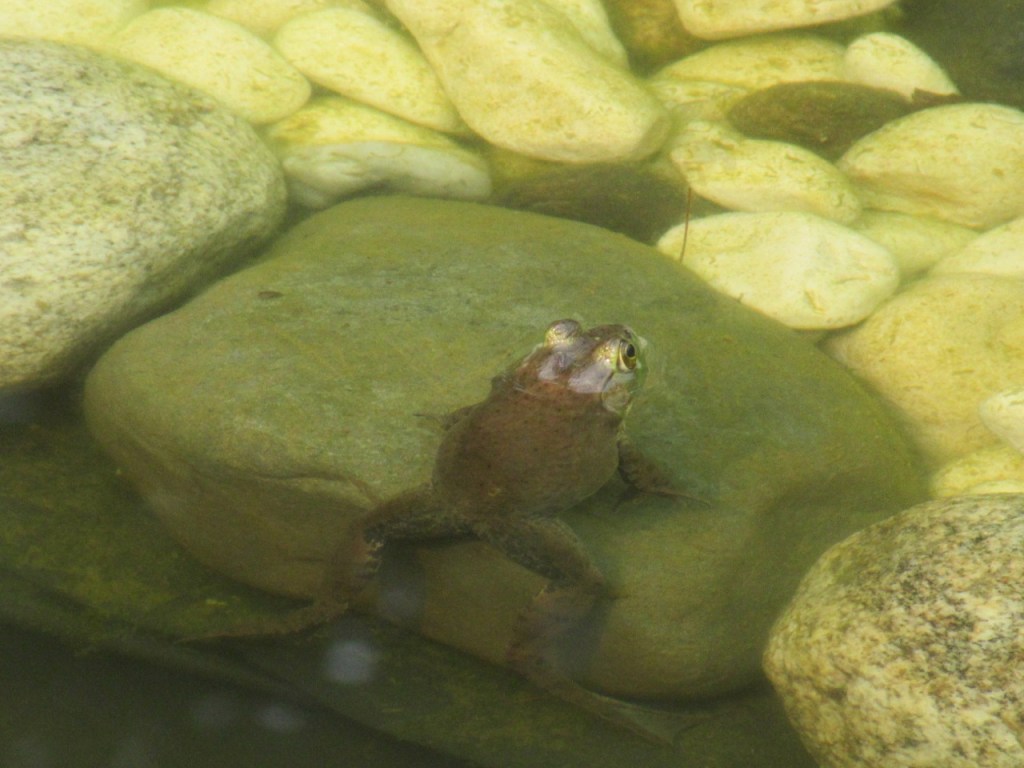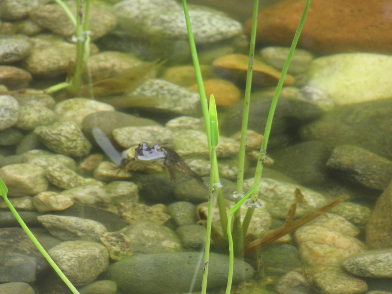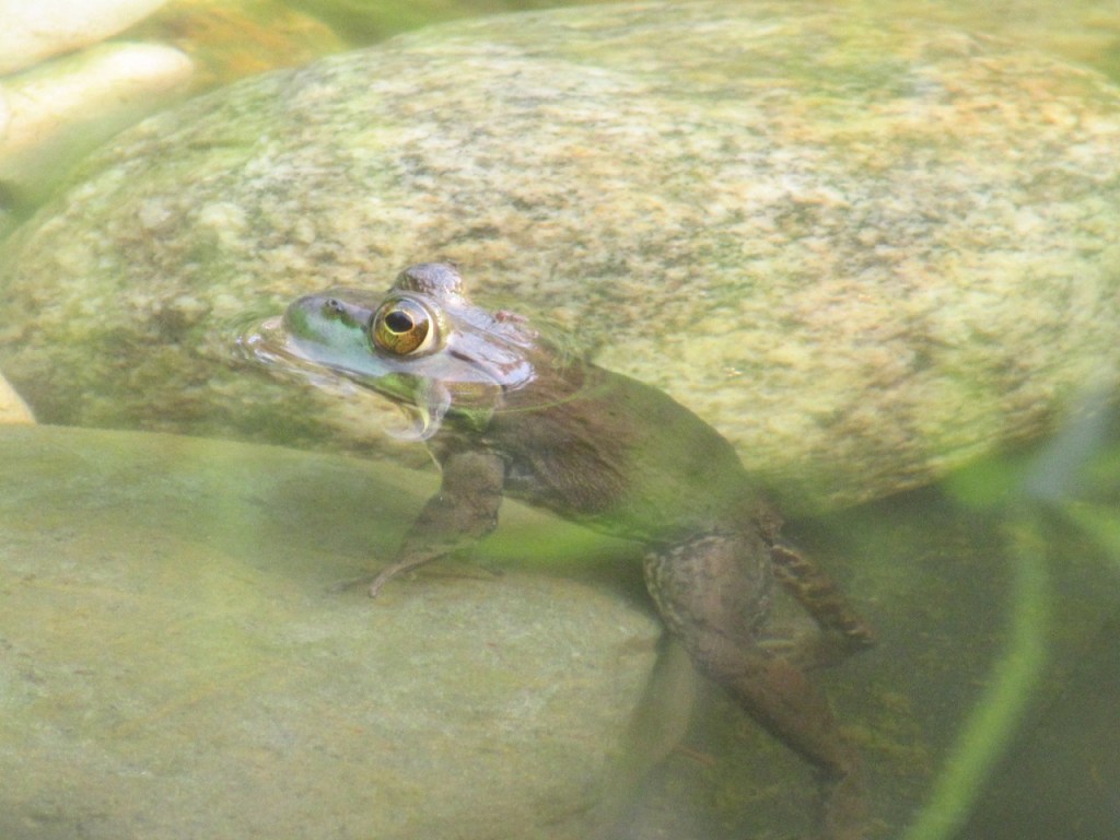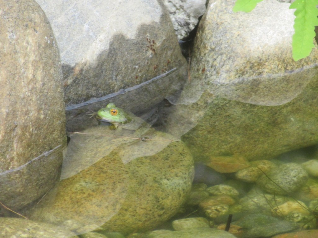 Yesterday, I was also able to take photos of frog #2, who was a little bigger than frog #1. But today, I saw both #2 and #3 after they re-emerged, and came to sit/float near each other by the little beach. #3 looked so much fatter/bigger than the other two, but then I realized depending on the angle, frog #2 could also be somewhat fat. I think they were about 2 1/2 inches long.
