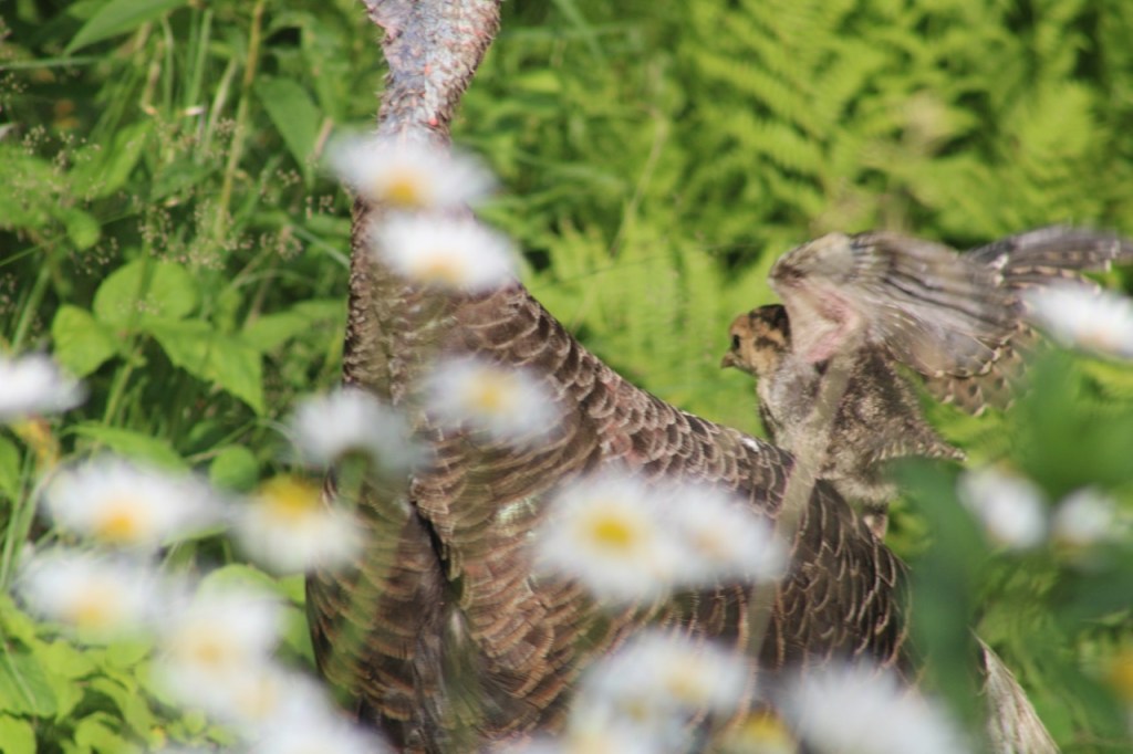 More yelling at the cat, then Margy joined me outside, and finally the cat ran out from under our deck down the driveway. The mother turkey was pacing back and forth and calling. We started looking for the baby, and Margy finally saw it under the deck, still alive, but looking injured. I recently had read a post on Facebook about what to do about injured birds, and so I called Avian Haven to ask their advice. Wendy suggested that I get it into a box, and then call back. They have a volunteer in the Portland area who could take it.