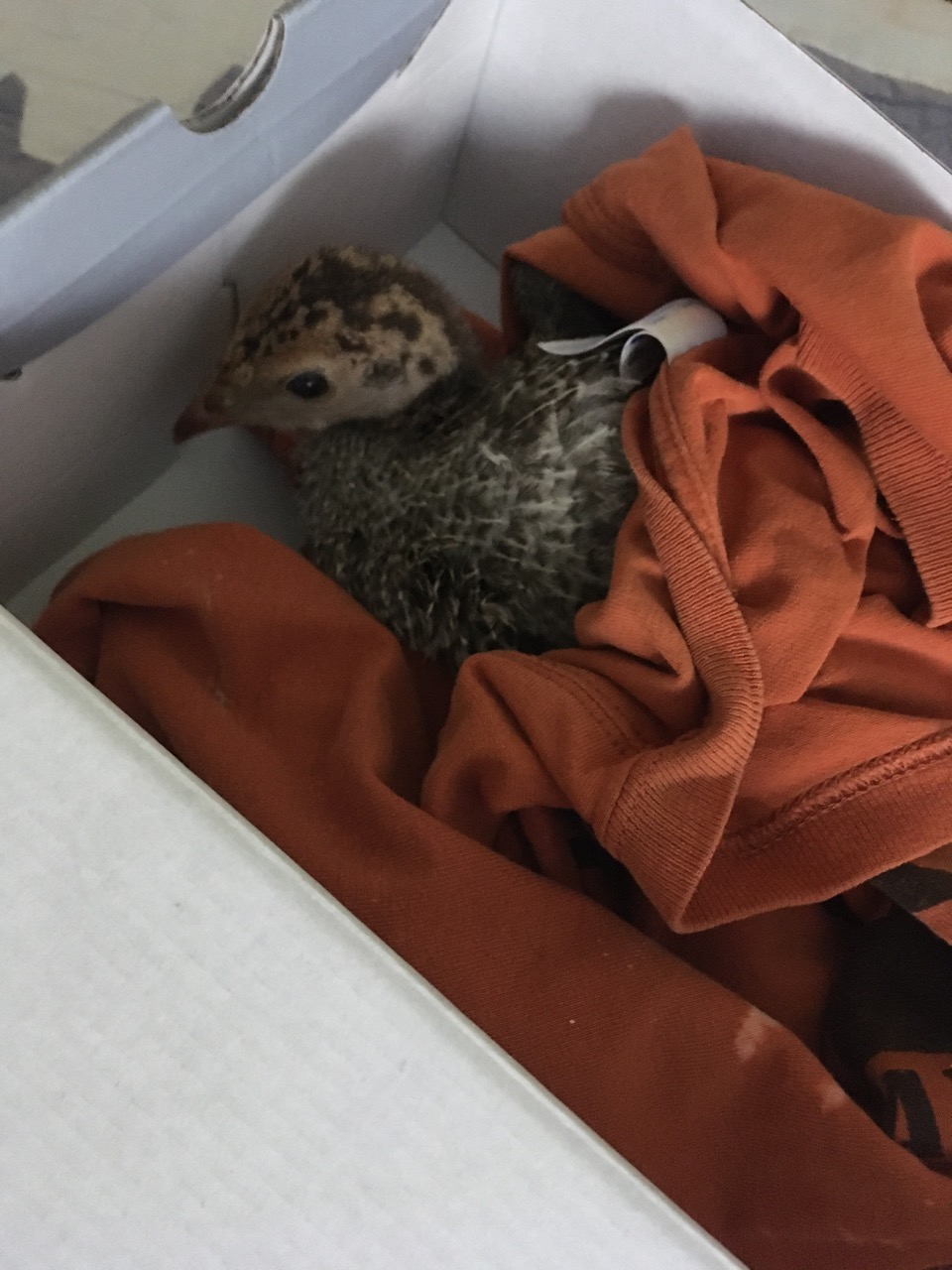 More yelling at the cat, then Margy joined me outside, and finally the cat ran out from under our deck down the driveway. The mother turkey was pacing back and forth and calling. We started looking for the baby, and Margy finally saw it under the deck, still alive, but looking injured. I recently had read a post on Facebook about what to do about injured birds, and so I called Avian Haven to ask their advice. Wendy suggested that I get it into a box, and then call back. They have a volunteer in the Portland area who could take it.
