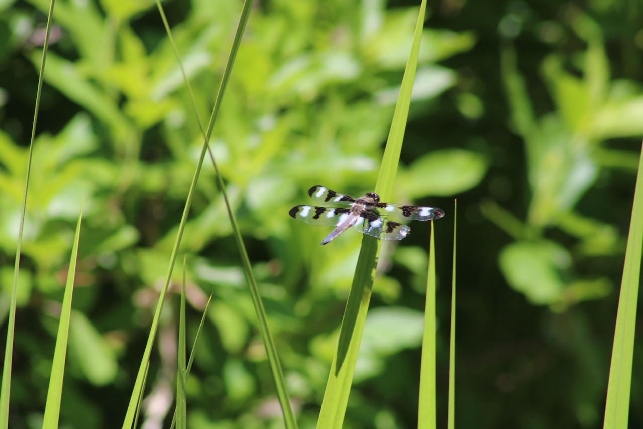 I’ve seen dragonflies flying around the pond, mating above the pond, and dipping their tales into the water to lay eggs. I’ve seen dragonfly larvae in the pond swimming around. But until this week, I never knew if any of the larvae had lived long enough to transform into adult dragonflies. During the last few days I saw what I thought might be some sort of insect perched near the bottom of an iris stalk. But with a little research, I now realize that it is an empty husk from which a dragonfly larva has molted.