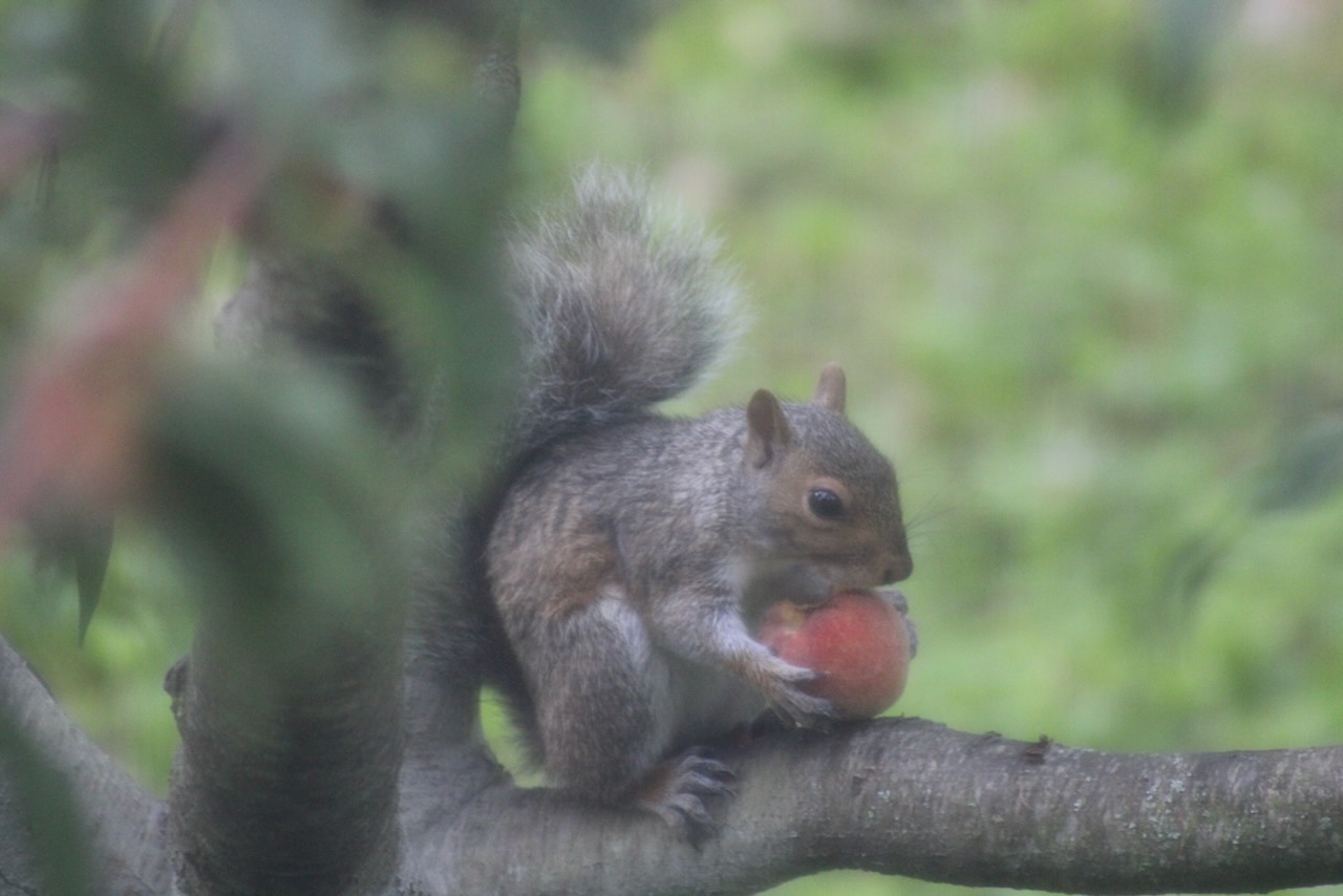 We haven’t been that successful in growing food for ourselves in the garden. (Yes, the experiment with the kale worked well. And we harvested blueberries and raspberries.) But right now the peaches are getting mold on them just as they ripen. Another fungal issue. I’ve started harvesting some that are not yet quite ripe, and just cutting them up to put in the freezer. But in the meantime, the squirrels and a groundhog are happily coming to the tree each morning to eat a peach. The squirrel climbs up the branches to pick her own, but the groundhog takes one that has dropped off.