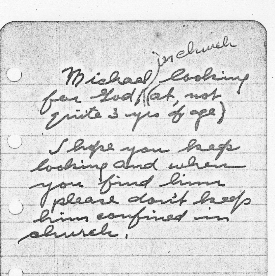 We finally have someone to clean our house today, after no one since COVID. (A true blessing for those of us allergic to dust.) So I am in the basement, where I have an office filled with old papers that I still haven’t cleaned out since I retired three years ago. I am allergic to old papers, too, (and old books, which is a real sadness). But it is hard to just throw them out or shred them, they are like messages from my earlier self. I thought maybe if I could capture some of them here, it would be easier to release these reflections of the preacher I used to be. (During the summers, I’d be pondering what to preach during the following year. I’d be trying to get grounded in what was most important.) It is grounding to read them now: