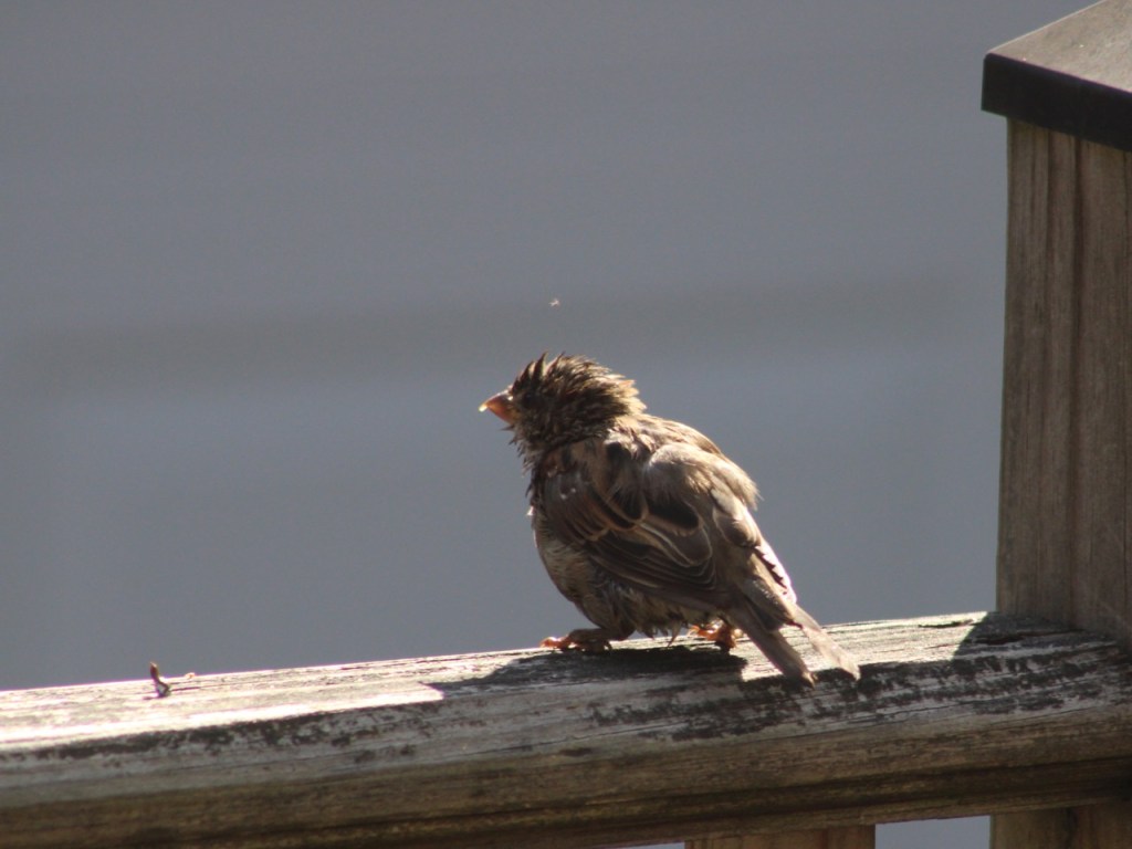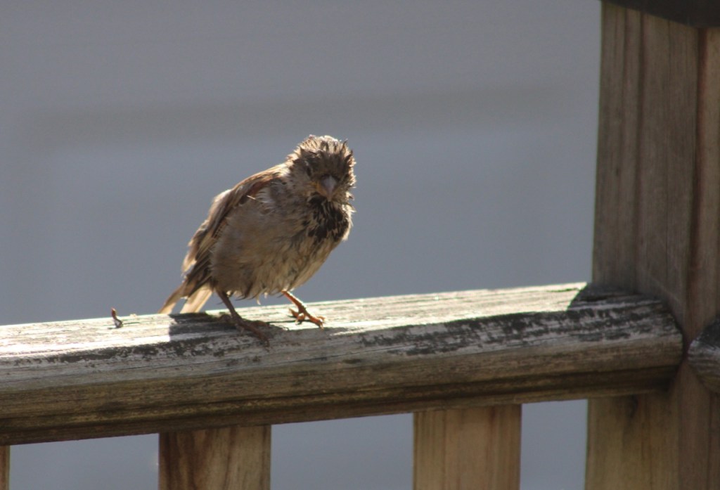 I feel such delight in all the small birds that love to be in our yard. Yesterday morning, the gold finches were all over the evening primrose stalks, eating seeds. Native self-seeded wildflowers for the win! Then I saw a few little brown ones–maybe sparrows–taking a bath in a puddle in the driveway, after the good rain we had the day before. Here is one drying off afterwards.