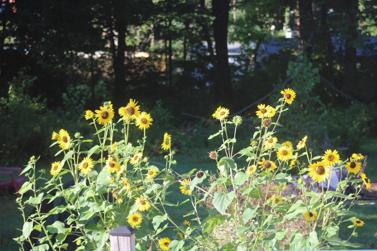 This is the view outside our back windows. We didn’t plant these sunflowers, they came up on their own, with help from squirrels and the bird feeder. These are the ones that goldfinches and bees love so much. Even a photo can’t capture the brightness of the flowers. They glow! They make me so happy each time I see them. I also always think of a dear friend who loves sunflowers, and that makes me happy too.