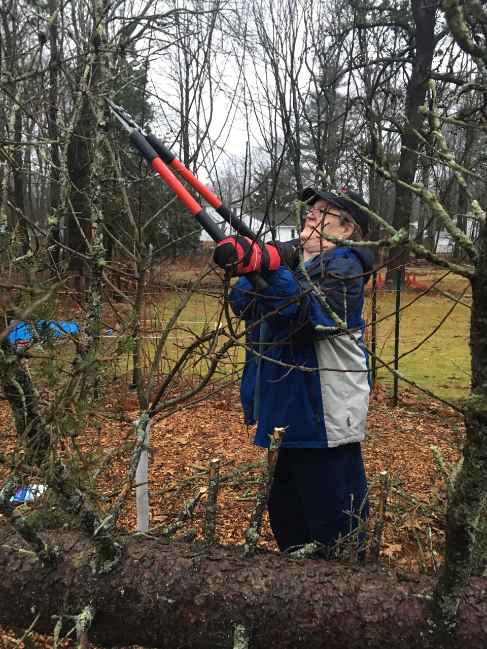 I don’t know how much damage the orchard trees suffered. When Margy got home from an appointment, she went out in the rain immediately to begin cutting spruce branches that were interfering with orchard tree branches. I guess that is something else that I love about her. Going outside in all sorts of weather, and caring about trees. I think if the branches can be freed from where they are bent, they might have a better chance of recovering.