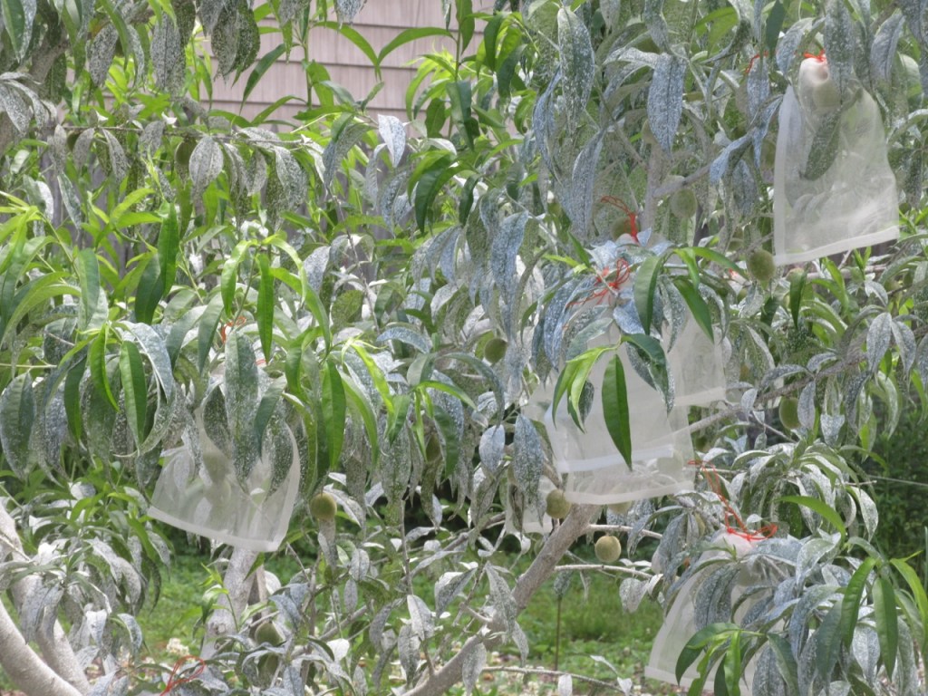 Photo: Peach tree, somewhat whitened by kaolin clay, with net bags around some peaches.