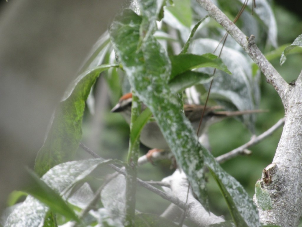 While I was slowly adding a few more bags, this little sparrow was chirping in the next tree over, as if she were trying to get my attention. (Later, I did some research, and she seems to be a native chipping sparrow.)