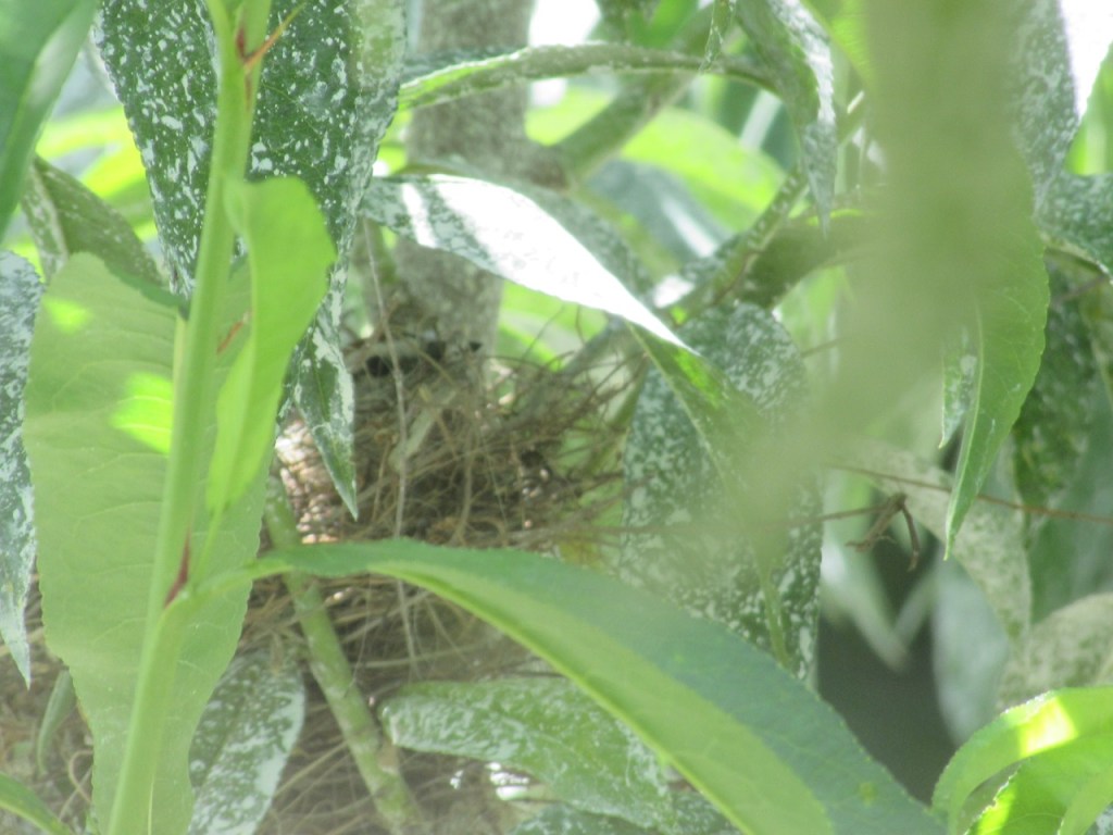 Photo: a nest in the branches of the peach tree, surrounded by leaves mottled with kaolin clay