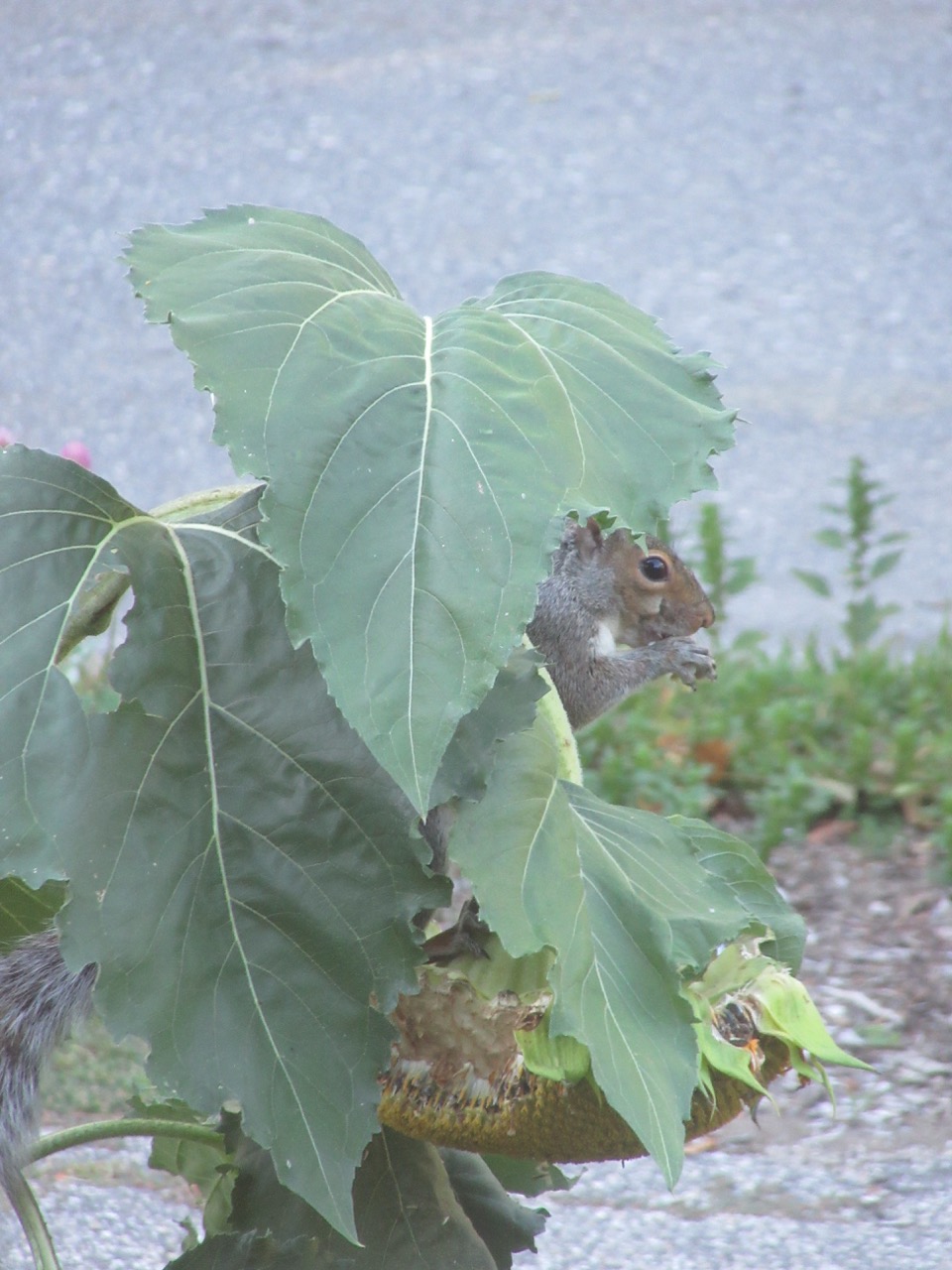 Photo by Margy Dowzer: Squirrel sitting, eating, on a sunflower last fall