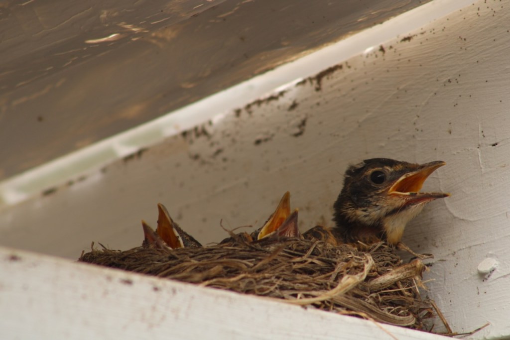 Something got at our baby robins… of the four in the nest, we just found three on the deck floor, two were dead, and one still alive–I gently put that one back in the nest, but not sure if it is really okay or how it might survive, we hope the parents will come back for it. They were calling loudly, but not around now. We don’t know what happened. One had disappeared entirely. So heartbreaking… We wondered if it might have been a chipmunk.