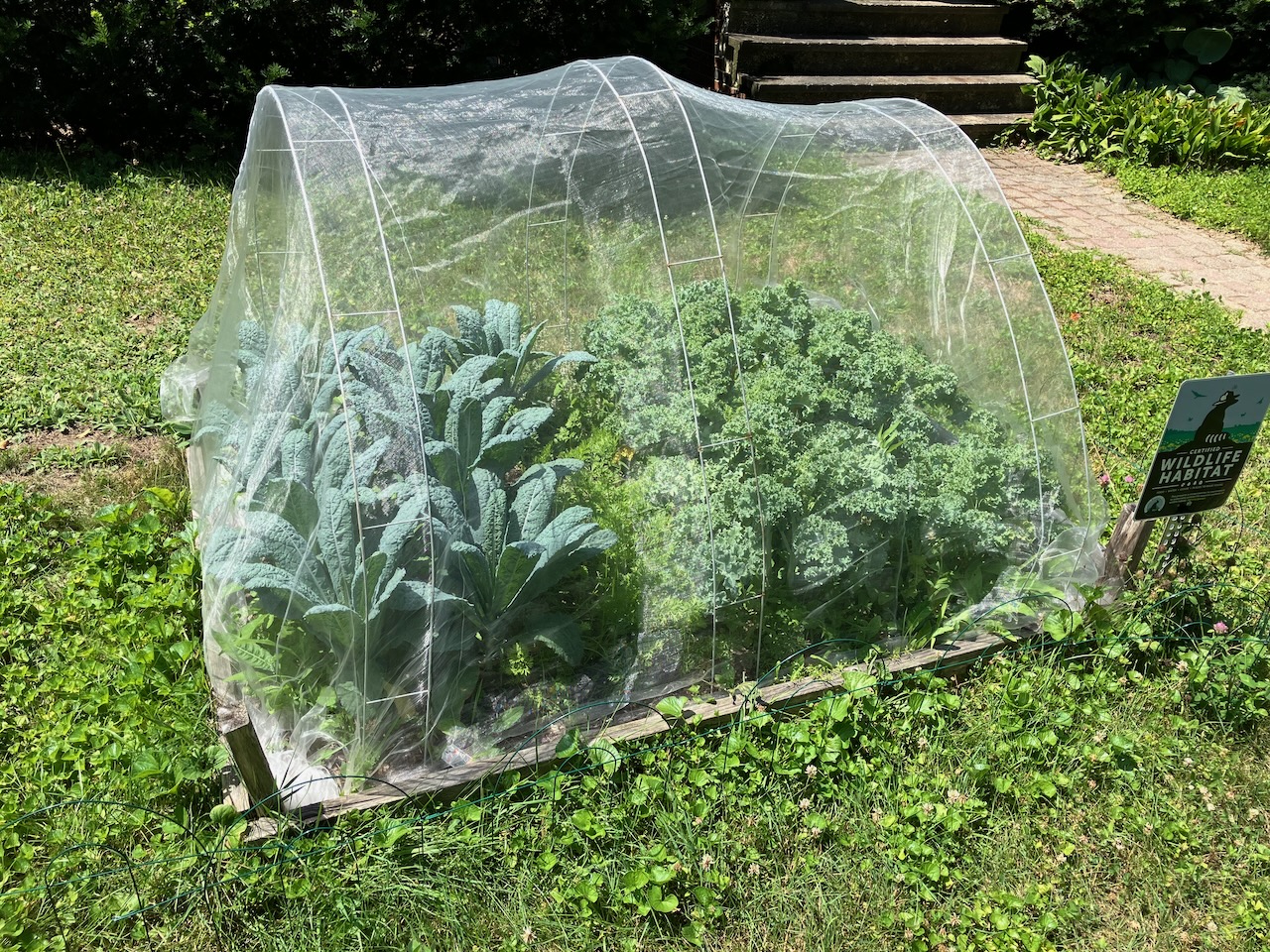 In the front yard, we never had monarchs lay eggs on our milkweed plants, despite their visit. Maybe next year? The netting on our kale and carrot bed was a great success. It protected the kale from cabbage moths, and no one tried to get into it. We have a ton of kale harvested and still to harvest.