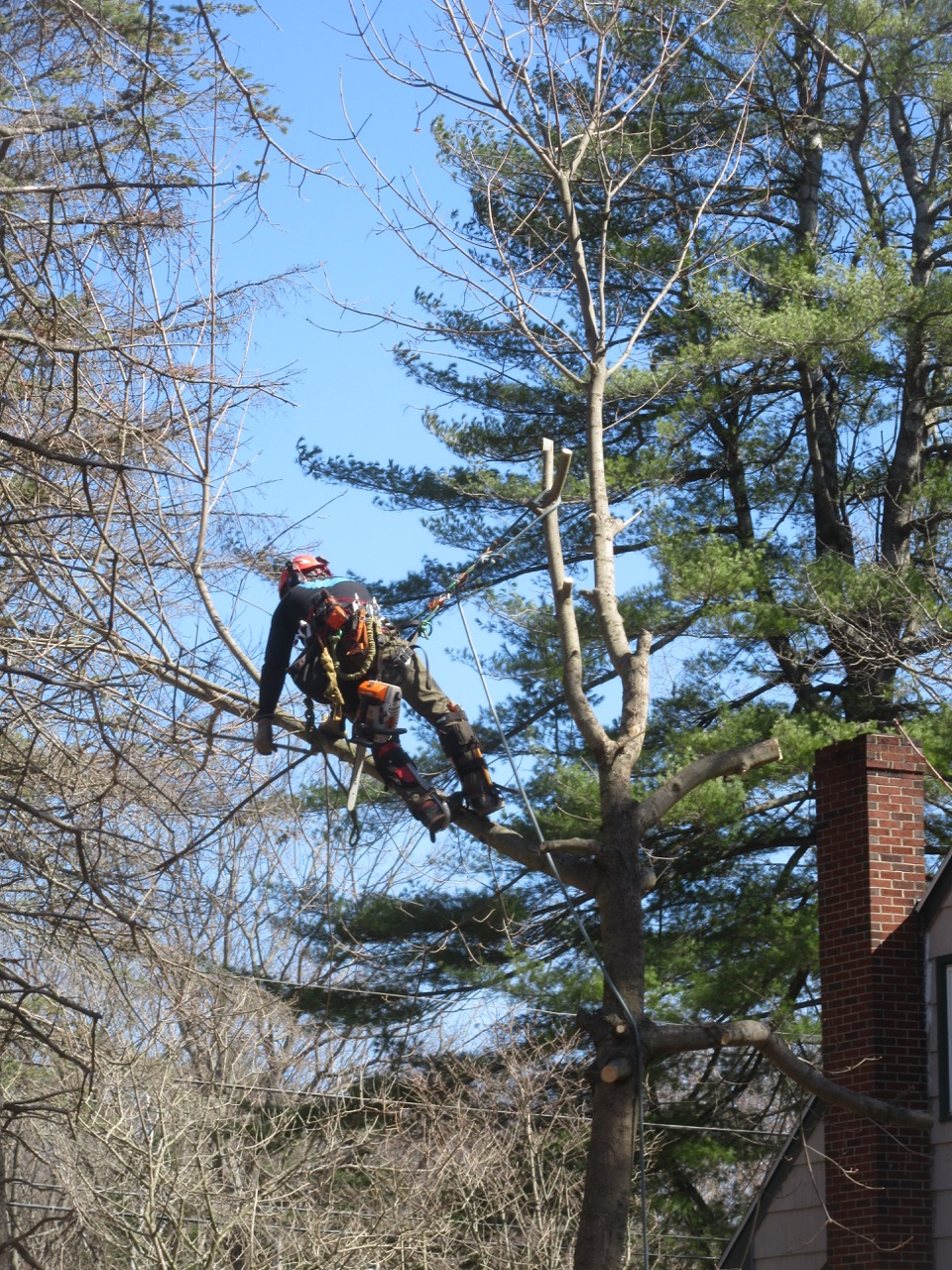 It was amazing to watch Dan climb the trees and with a system of ropes and pulleys balance himself on the tree, and cut it from within. We really like Dan, who has delivered free wood chips to our yard many times in past years. He is very tuned into permaculture, and told us he has an arrangement to deliver wood chips to Cultivating Community gardens this summer. In fact, our whole intense timeline of last week was based on the fact that he was going to leave us a pile of wood chips from the trees, and once that pile was there, a truck couldn’t get through to deliver compost where we needed it to be.