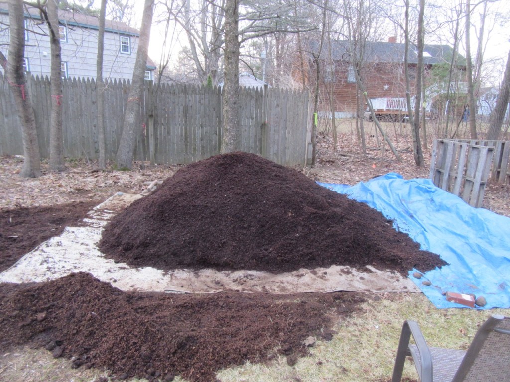 The goal was to completely empty the pile, because on Wednesday we were getting a new four cubic yards of composted manure from Wilshore farm. So I finished up Wednesday morning, and Wednesday afternoon we got our delivery. Then Margy and I were using shovels and rakes the rest of the day to slightly move that pile so it was all situated on top of old carpet, with at least a foot of clearance around the edges–so no more roots.