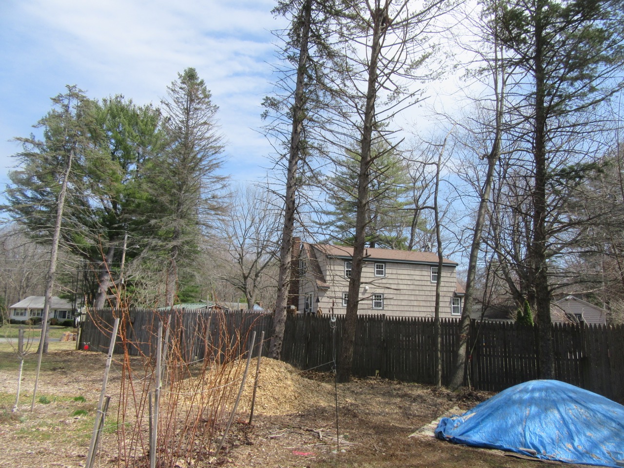 So here are our wood chip and compost piles, all set up for soil enhancement and mulching for the season. The area along the fence has opened up to offer more morning sun to the orchard–you can see four somewhat scraggy spruce trees remaining, plus a skinny red maple and oak near the right which will have more room to grow.